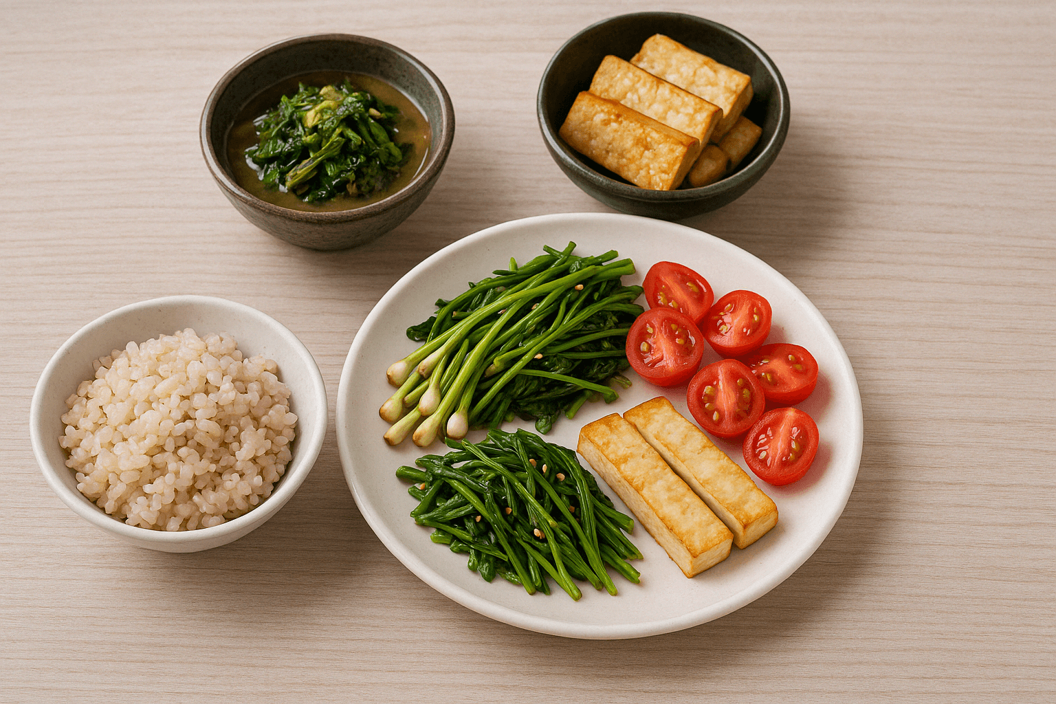 아침: 현미밥 + 달래된장무침 + 구운 두부 + 방울토마토 점심: 냉이된장국 + 쑥전 + 삶은 달걀 + 브로콜리 저녁: 보리밥 + 새싹채소샐러드 + 닭가슴살찜 + 나박김치(염도 낮추기) 각 식단은 제철 재료와 자연의 맛을 살려 염분을 줄이면서도 충분한 만족감을 줍니다.